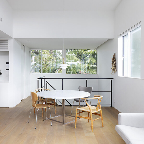 大きなピクチャー ウィンドウで 借景の緑を室内に取り込む