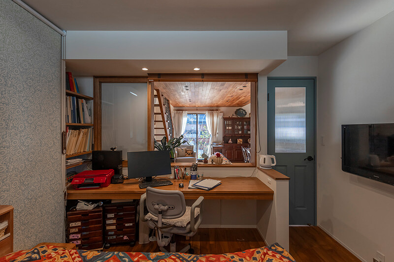 寝室のデスクスペース。室内窓を開くとリビング空間や窓の向こうの庭へとつながります。