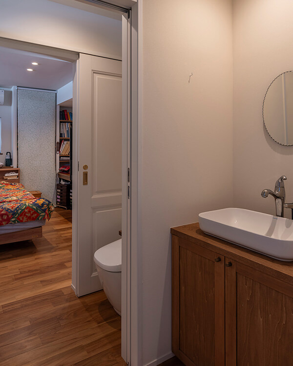 写真手前と奥の2カ所に引戸を設置。来客時は寝室側の扉を施錠することにより、プライバシーが保たれます。