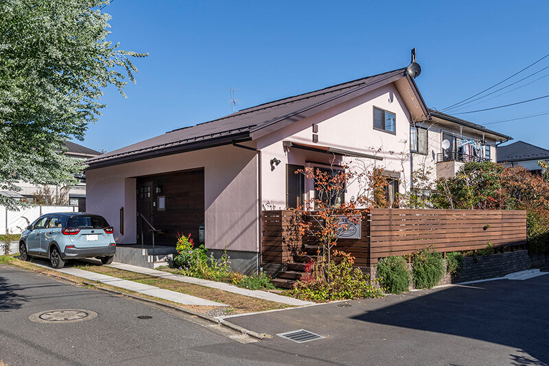 施主の依頼で淡いピンクの外観に。ウッドデッキへの入口はキッチンの勝手口へと直結しています。