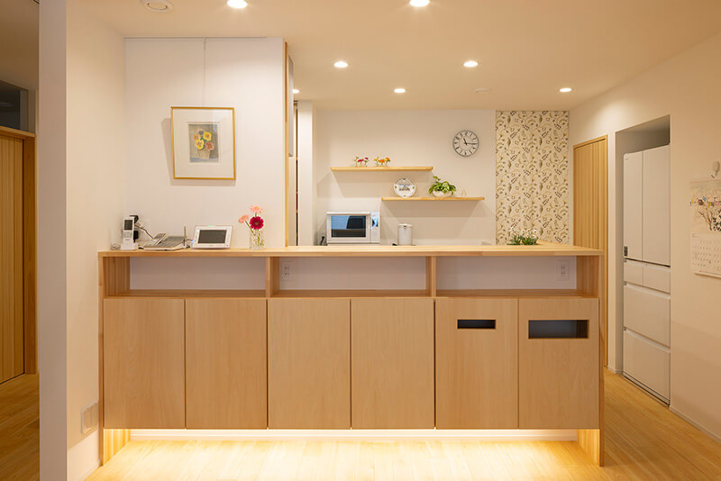 フロートタイプのキッチンカウンターは、ゴミ箱やティッシュがぴったり収まるサイズで造作。足元の間接照明で奥行を深く見せています。