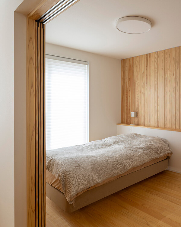 奥様の寝室。リビングとの間は圧迫感のない引戸を採用。木目の美しい板壁とヘッドボードで立体感が生まれています。