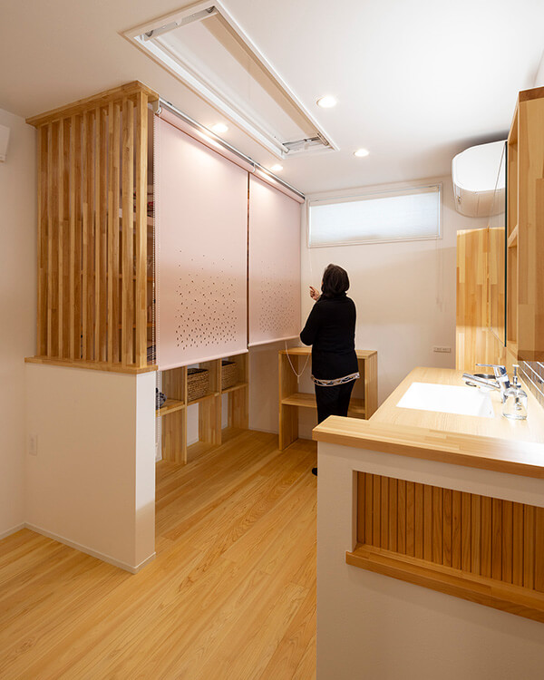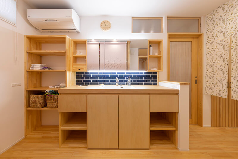 キッチンや脱衣室は、動線に無駄のない回遊式。ゆったりとした通路幅やスライドドアを採用し、未来を見据えたバリアフリーな設計を意識しました。
