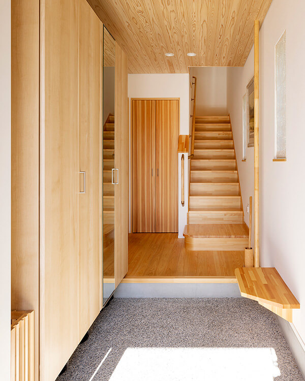 洗い出しの土間に手すりとベンチを設置。靴の脱ぎ履きがしやすくなりました。玄関階段なので気兼ねなく2階へ直行できます。