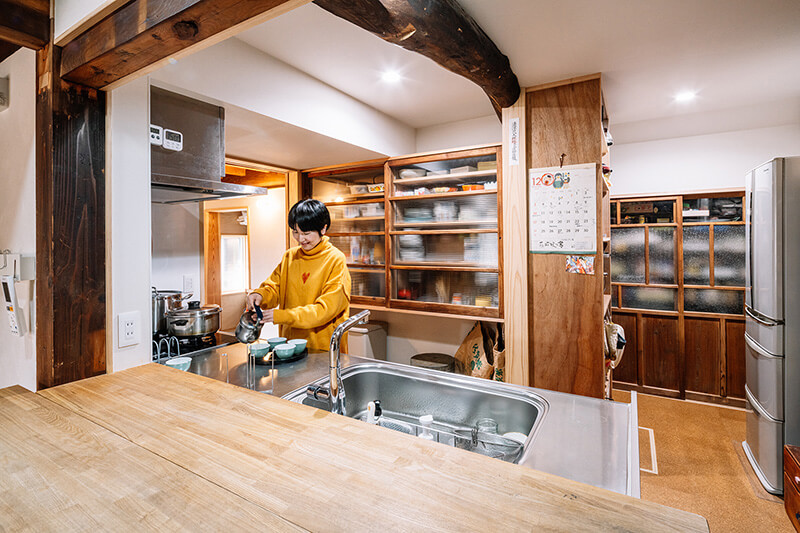 モダンな黒い外観に対し、室内は木目や漆喰の塗壁を生かしたナチュラルな雰囲気。家と共に代々受け継がれてきた家具や生活道具も違和感なくなじんでいます。さらに、既存の家の窓ガラスをキッチンの食器棚やパントリーの扉に再利用。新旧が調和するリフォームの醍醐味を随所に感じることができる空間となりました。