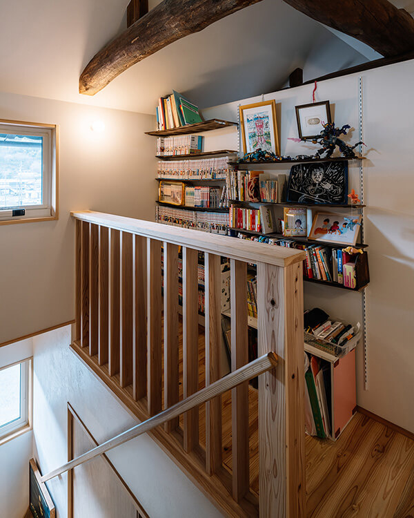階段横の図書コーナーは余った木材を使って奥様がDIYで製作。