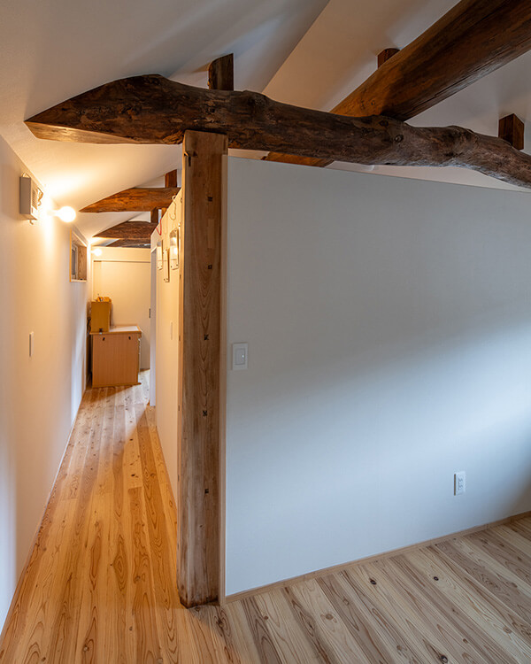 梁を生かすためにも、上部を空けた壁を採用。空間にゆとりが生まれると同時に、家族の気配も感じられます。