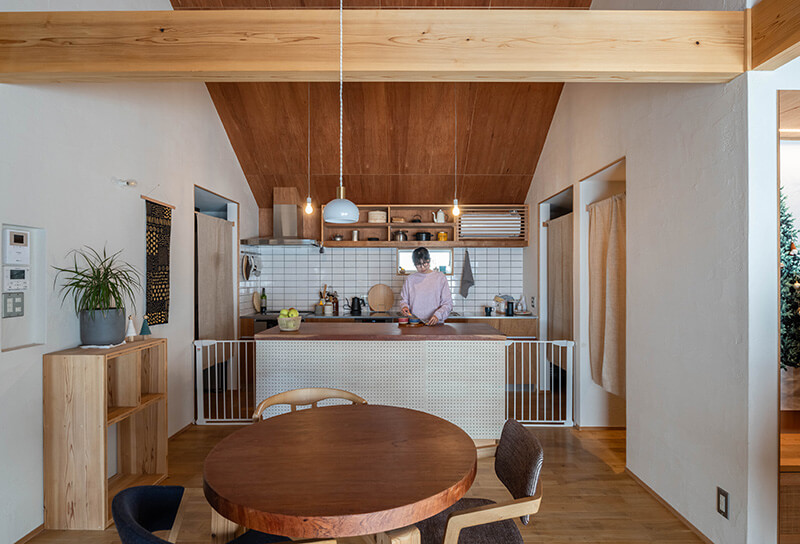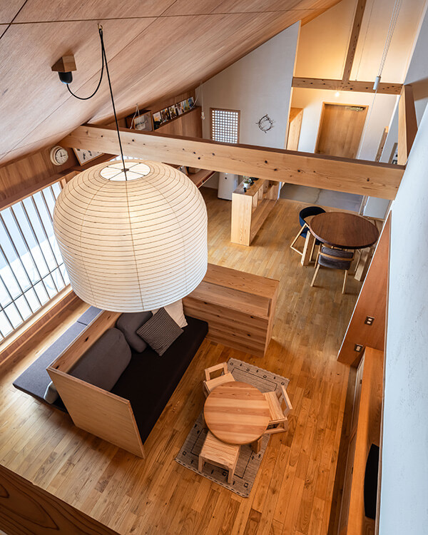 また、ご夫妻の「自然の風合いを感じられる暮らし」という希望に応えた工夫も随所に施されています。壁は調湿性・消臭性に優れた十和田石配合の珪藻土を採用し、玄関ドアや階段は網代名栗加工仕上げに。さらに、高性能セルロースファイバーの断熱材を使い、通気性の高い船底天井には断熱材専用の下地を組み込むなど、細部まで追求して高気密・高断熱な家を実現しています。