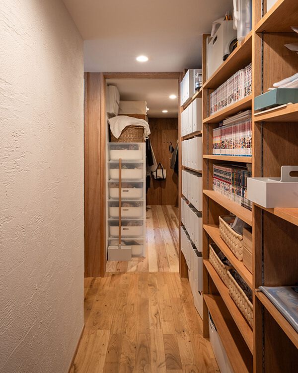 裏動線上に壁面収納を配し、奥のウォークインクロゼットから主寝室に出入りすることができます。