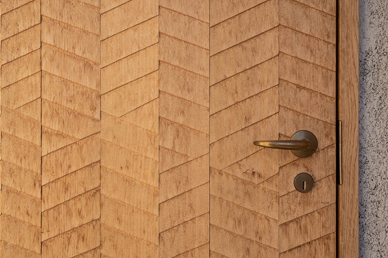 職人の手仕事が光る、網代名栗加工を施して風情ある仕上がりに。分譲住宅地に調和する外観にしつつ、細部の意匠で個性を表現しています。