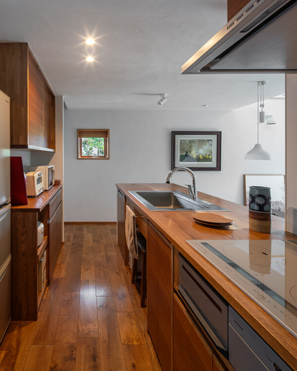 庭の景色を存分に楽しめる新居は、「四季の移ろいを感じられるキッチンからの眺めが特にお気に入り」と奥様。「ダウンサイジングしたことで、かえって生活の質が向上した」というご主人の言葉通り、ご夫妻の第2の人生にふさわしい住まいが完成となりました。