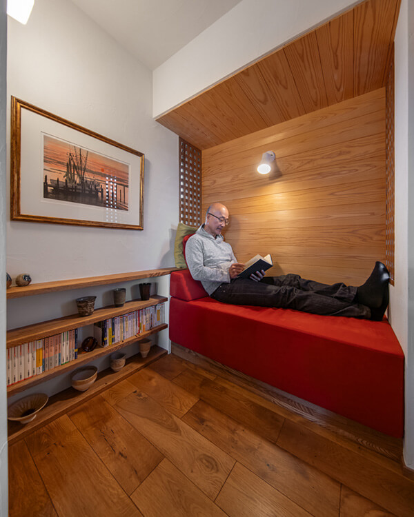 「家の中で一番のお気に入りの場所」とご主人が愛用するヌック。光を程よく取り入れる格子窓は、目隠しの役目も果たします。