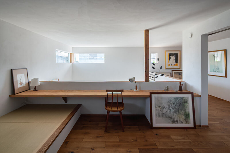 吹抜けに面したカウンターデスクは、読書やパソコン作業に最適な明るさ。畳の小上がりでは、くつろぎの時間を過ごせます。