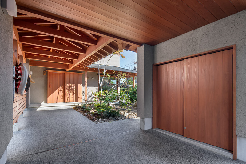 大谷石を敷き詰めたアプローチは屋根つきで、雨天時も快適な動線に。玄関までの上質な風情が、住まいの格調を高めます。