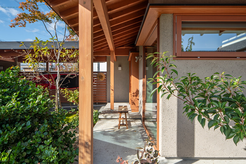 ナチュラルな庭と縁側のような中間領域が内と外をゆるやかにつなぎ、開放感とプライバシーの絶妙なバランスを演出。