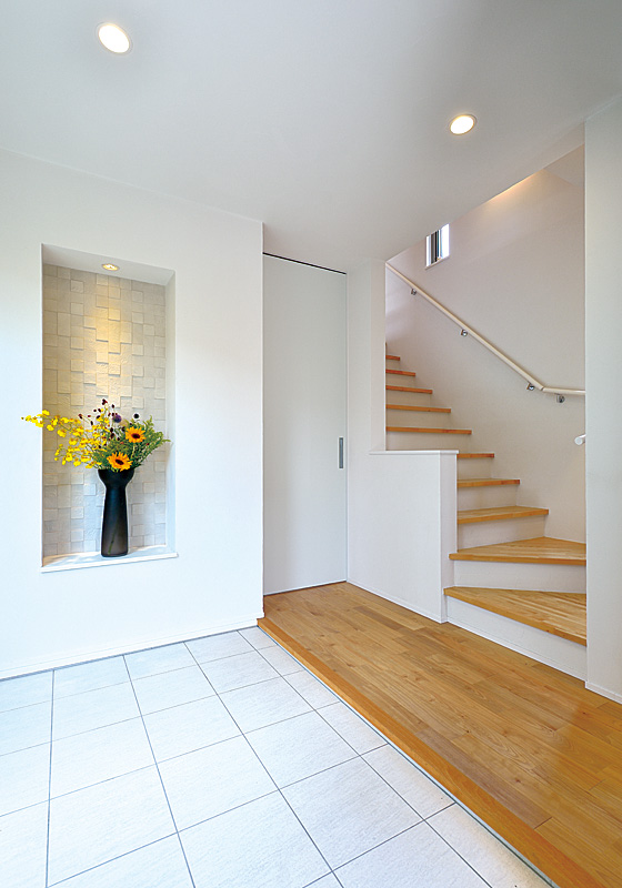 白を基調にまとめた明るい玄関。壁面には飾り棚を設けました。シンプルなインテリアに花も鮮やかに映えます。