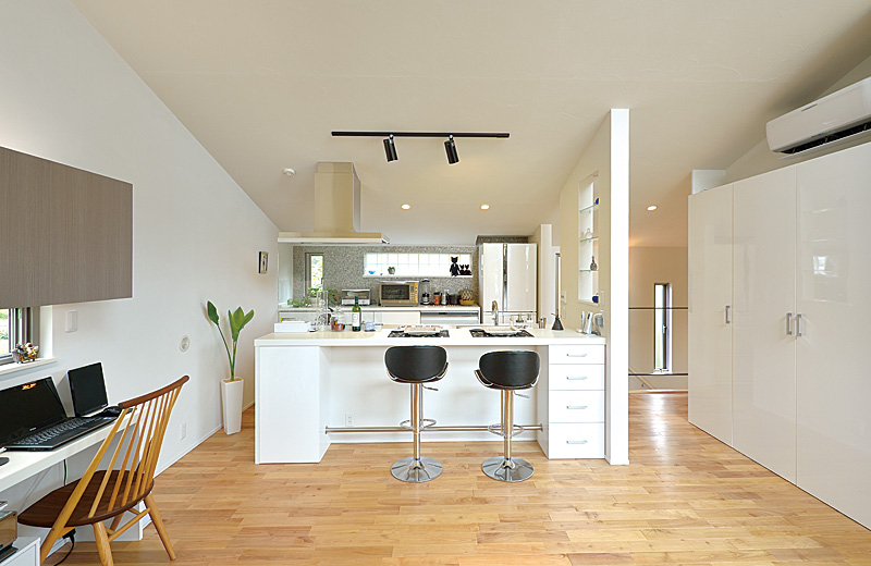 対面式のキッチンを採用し、LDKの一体感を高めています。東側には大容量の壁面収納を設置。モノがあふれがちなリビングをすっきり片付けることができます。