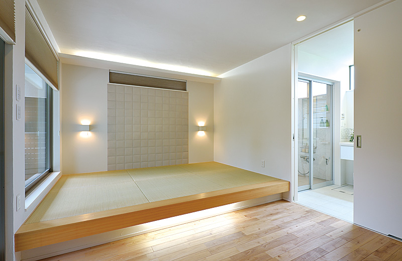 1階の寝室の隣には洗面室と浴室を配置。就寝時は、入浴後にすぐ寝床へ入ることができるほか、起床後の洗面、身支度もスムーズに行えます。足元を照らすため、床との段差には間接照明を設置。