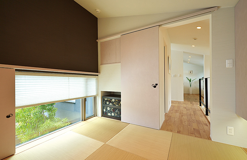和室にはシンボルツリーを眺められる地窓も設けられました。シックなカラーリングでまとめられた室内が鮮やかな緑で彩られます。