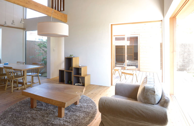中庭にはウッドデッキを設置。室内の床とレベルを合わせ、内外の連続感を高めています。