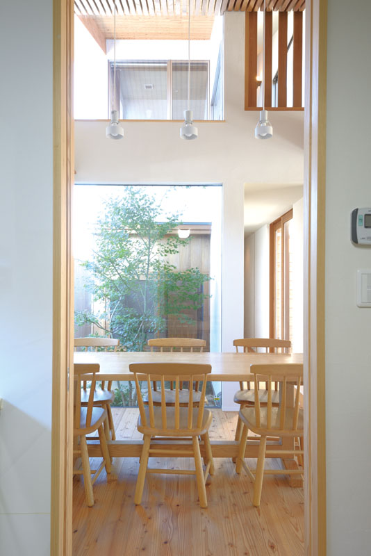 ダイニングは中庭に向けてオープンに。上下の大開口で屋外の開放感をいっぱいに取り込んでいます。