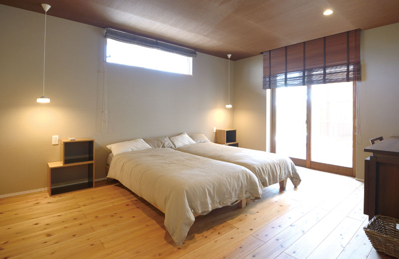 1階の奥に配置された寝室。掃き出し窓以外は、スリット窓にして、落ち着いて休める部屋にしています。
