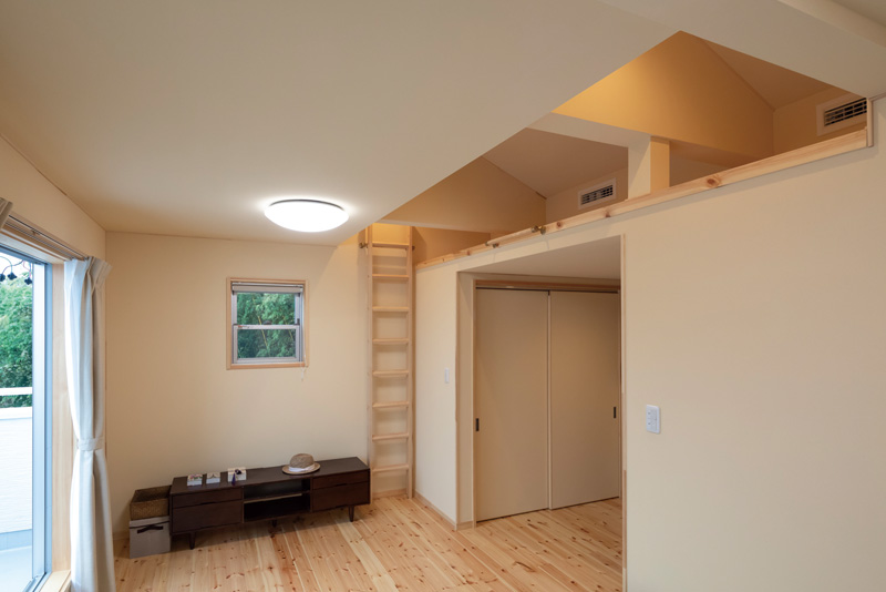 2階の子世帯の寝室は、ロフトを設けて収納空間を確保。将来的には子ども部屋にすることを想定しています。