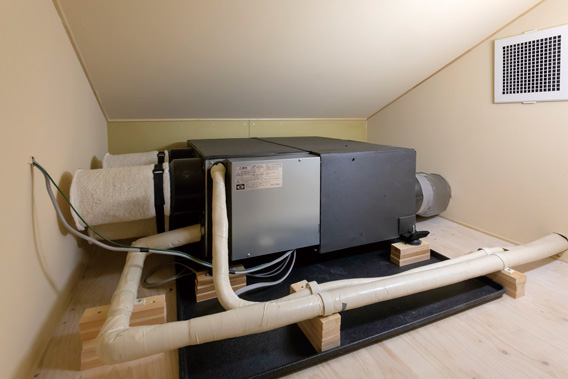 パッシブエアコンの主装置をロフト部分に設置。冬場は床下からの暖気で床を温め、夏場は冷気を天井から落とすことで一年を通じて室内を快適に保ちます。