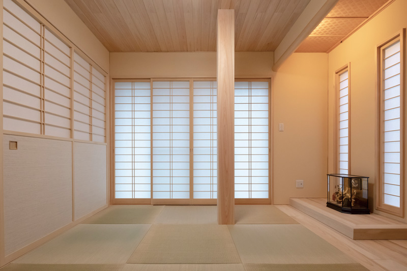 今回のリフォームでは、二世帯の生活スタイルを考慮したプランに変更し、続き間だった和室の一つをリビングダイニングに変更して二世帯が集う広々としたLDKを実現。このLDKを中心に、玄関ホール横の扉を開ければ親世帯、リビング階段を上がれば子世帯と、互いにストレスが無く、適度な距離感を保てる間取りとしています。