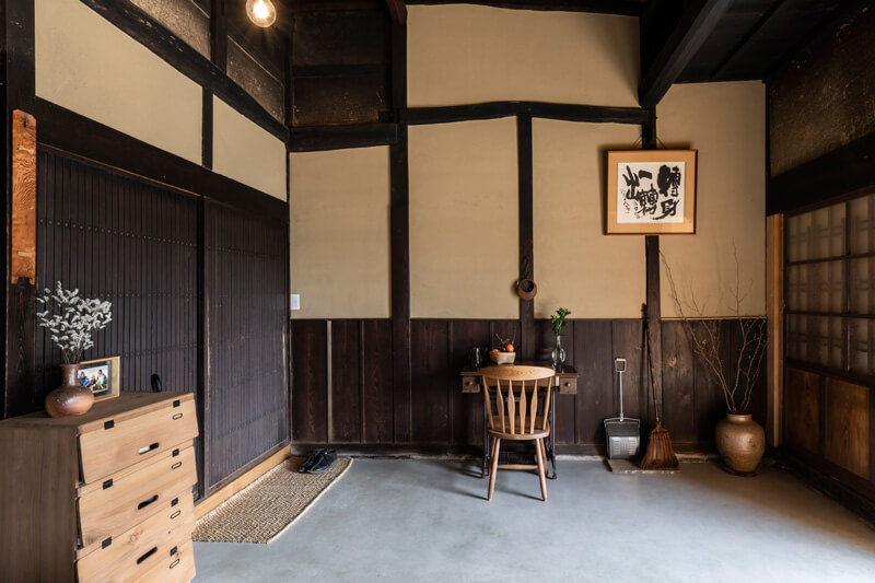 比較的状態のよかった土間は、既存の腰板や柱を残し、往年の面影を伝える空間に。高い天井には断熱材を入れ、床はモルタル塗り、壁は下塗りと珪藻土で古民家らしい趣を再現しました。