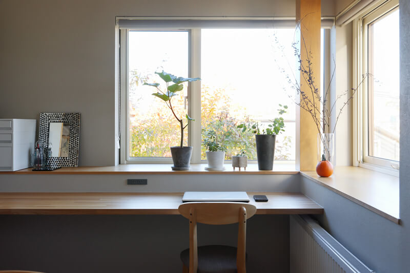 ダイニングのそばに設置したコーナー。サッシ「エルスターS」(LIXIL)は二面採光で明るく、圧巻の眺望。家にいながらカフェ気分を楽しめ、ワークスペースにも最適。