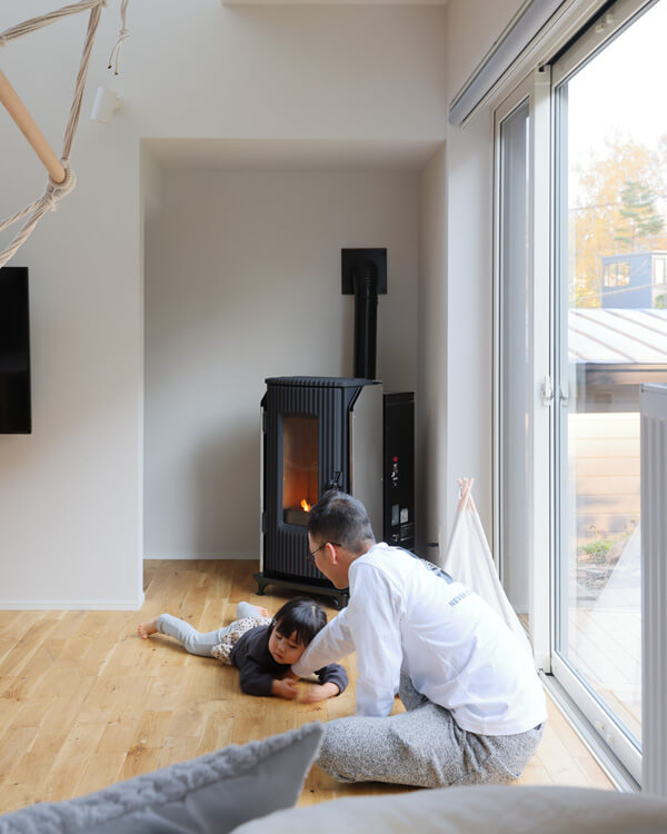 薪入らずで着火がスムーズなペレットストーブを階段下に設置。存在感をセーブしつつ、穏やかな暖かさと炎のゆらぎを楽しめる絶妙な配置です。