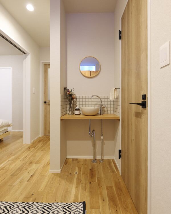 玄関横に、小さなセカンド洗面を設置。帰宅時の動線上にあり、手洗いがスムーズ。ニューノーマルな暮らしに対応します。
