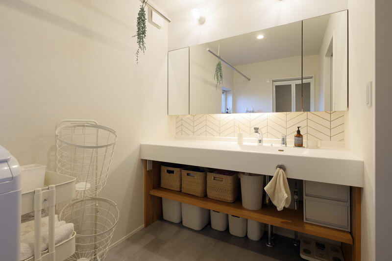 洗面台の下や鏡裏に収納を確保。広々とした洗面台は、メイクや身支度に必要なアイテムを広げやすくストレスがないと大好評です。
