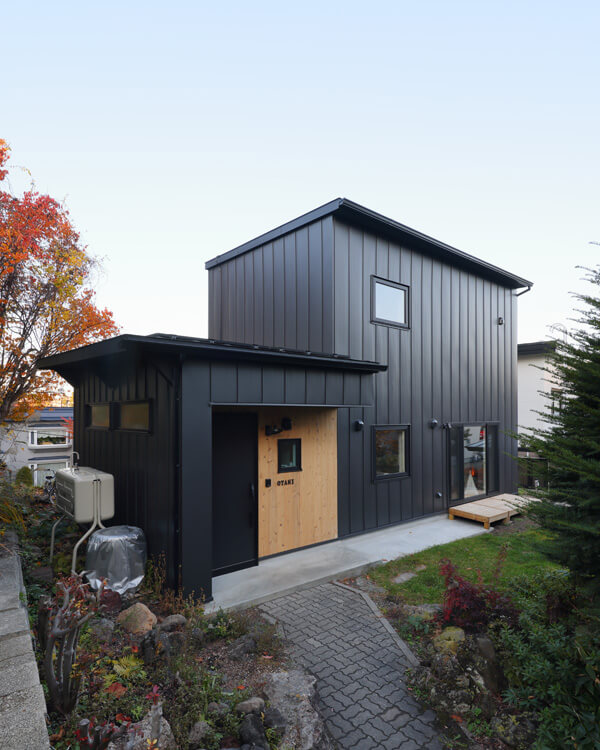 屋根にソーラーパネルを設置し、エネルギーを自給できる仕様に。玄関ドアには断熱性の高い「ジエスタ2」(LIXIL)を採用しています。