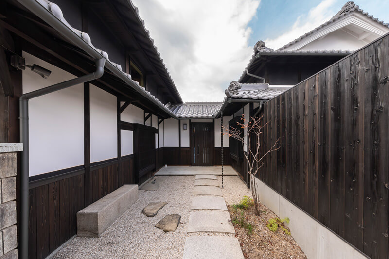 ギャラリーと庭に挟まれたアプローチは、移設した飛び石に伊勢砂利を敷き詰め、“おもてなし”のエントランスを演出しています。