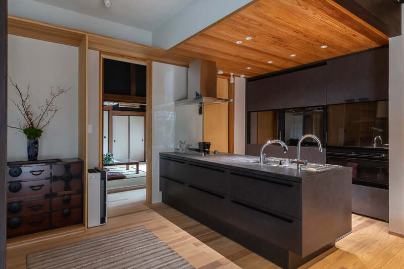 田の字づくりの和室から客間、食堂、居間に改築されていたスペースは、梁を現し、開放感のあるLDKとして再生。耐力壁をプラスしたリビングの窓まわりは、木製のガラリ、高断熱窓、障子を重ね、日本的な美しさを際立たせています。ガラリと障子を引き込むと視界が広がり、窓枠が切り取る絵画のような風景がキッチンからも楽しめるように。往時の面影を残す建具は造作収納の引き戸として再利用させ、既存の家具ともなじむモダンなスタイルに仕上げました。