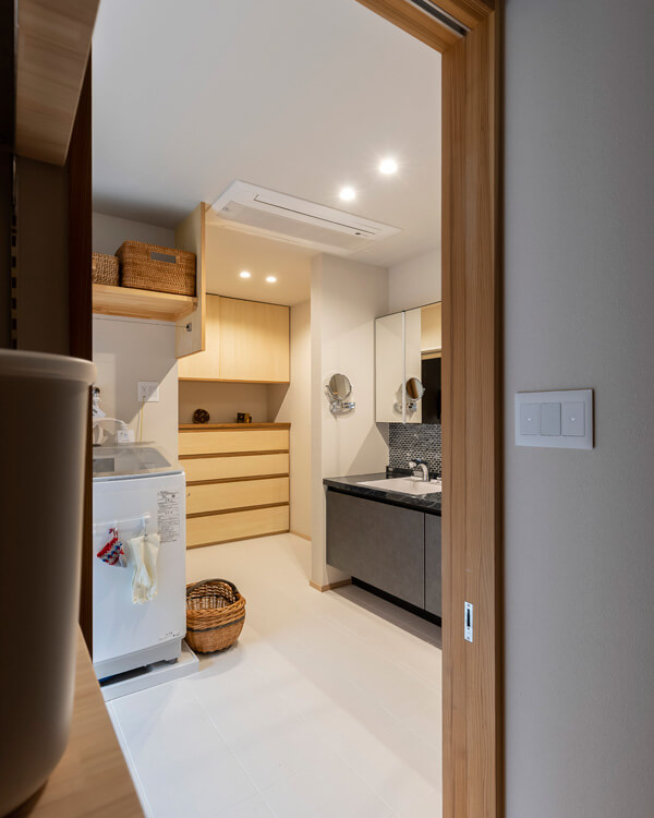 キッチンの後ろに洗面室兼家事室を配置。コンパクトな動線で移動のストレスを解消し、毎日の家事をスムーズに。