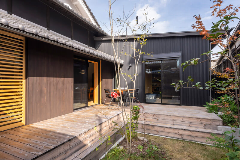 瓦屋根の外観に調和する木製ガラリで、視線を遮り、プライバシーを確保。デッキの段差がベンチ代わりに。