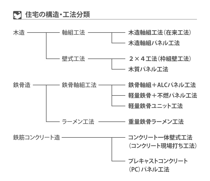 - 工法は建てる方法を指し、大きくは軸組と壁式に分かれる